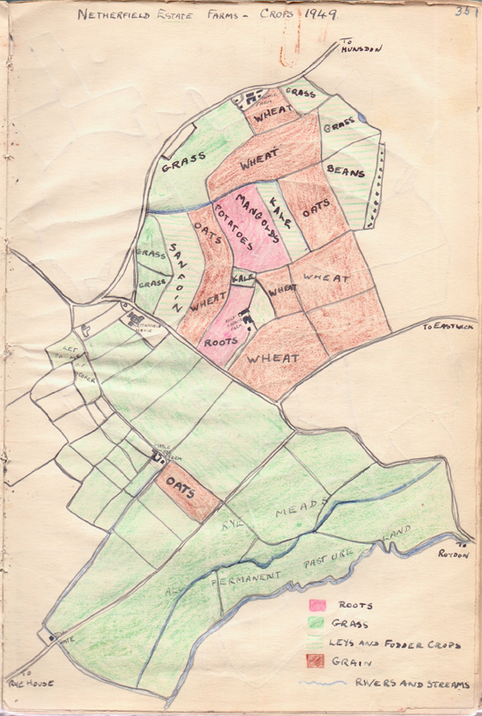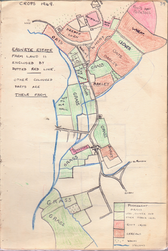 Easneye Estate has always had a dairy farm, but during the war, 60 acres were ploughed in the park, including the cricket pitch. At present roughly 50 acres of corn and 10 acres of roots are grown, but the dairy farm no longer keeps any cows several fields being let to various farmers instead. Six men are employed in farm or garden work.