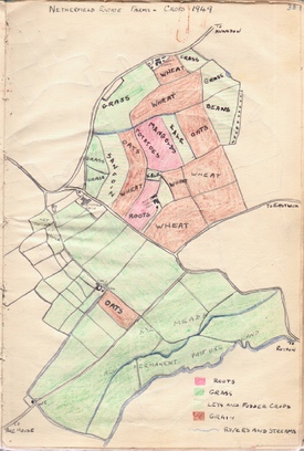 Total acreage 600, made up of 40 acres root crops, 230 acres grain, 330 acres grass and fodder crops. About 170 Shorthorn cattle are kept, a sale being held at the farm in October each year. Three Shire and Percheron horses and six tractors are used. 50 Essex pigs and about 50 Light Sussex /Rhode Island Red fowls are kept.
