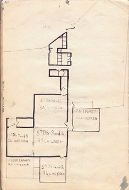 The plan shows the school building . Present numbers are infants 48, Juniors 73, Seniors 62, with a staff of a Headmaster and two men and four women assistants.