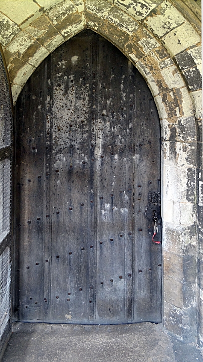 The main entrance. This south doorway is 13th century. The floor of the porch is stone coffin lids but they have been cemented over.
