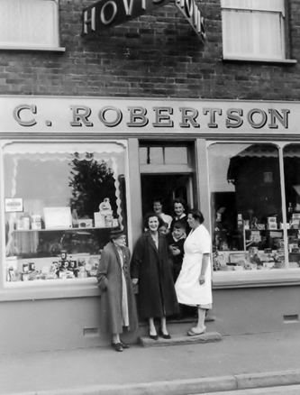 2nd from left Jess in dark coat, lived halfway down South Street on the left hand side. Jess helped Mrs Robertson when she was ill. Sheila Livings 3rd from left [right at the back in the doorway] worked in the shop. She now lives in St. Andrews Street Hertford. [2014]