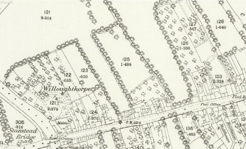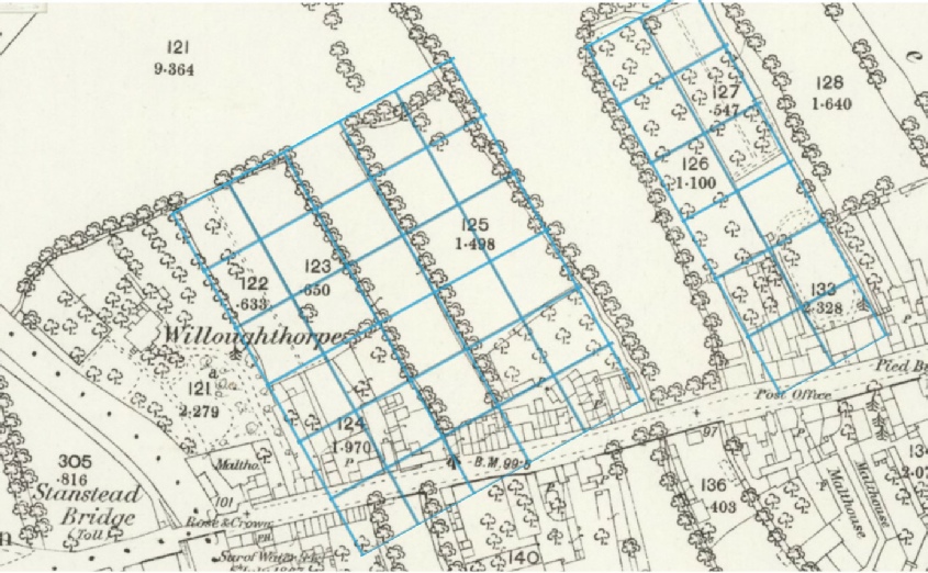 Historian Susan Oosthuizen has suggested that confirmed burgage plots could be matched to the number of burgesses shown in Domesday; in the case of Stanstede that would be 7. It is possible to do this match but only if the empty plot (part of 121) is counted as a burgage plot. It could be retained as an empty access to the mead beyond if either part of Willoughthorpe (spelling as shown on the map above) is included (which may indeed have some remnants of a boundary) or if part of the Red Lion site was included. This would require specialist interpretation.