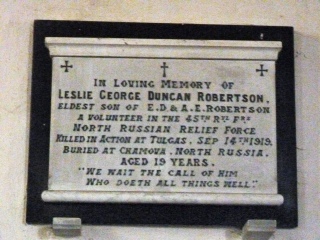By the middle of 1919 it had been decided to withdraw all Allied troops, despite them having won a significant victory at the battle of Troitsa on 18th August 1919, evacuation began at the beginning of September 1919. On 14th September 1819 Leslie was killed near the small village of Turgas and is buried nearby. He had taken part in an attack on a Bolshevik blockhouse near the village into which the 45th Royal Fusiliers had pushed the enemy. In a counter attack the 45th were forced back and it was in this action that Leslie was killed.
