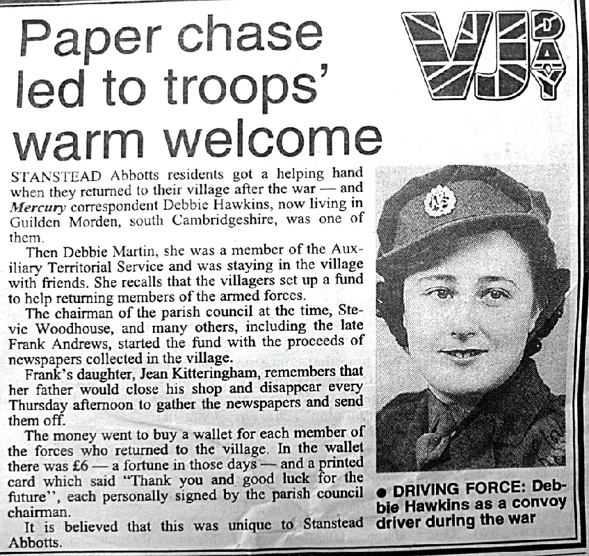 Debbie Hawkins was one of these recipients, having been a driver in the ATS, a friend of the Andrews family, having been a lodger before and after the conflict , she eventually became a reporter for the Royston Crow Newspaper.